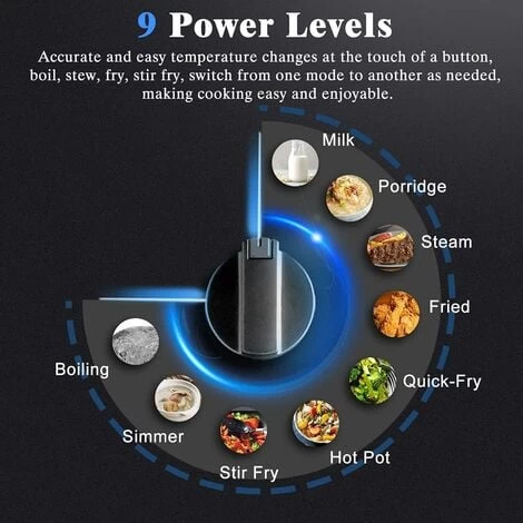 - ????【Knob Control】Easy to operate and use with no complicated button controls. Prevent children or family pets from accidentally touching the switch button; swap between 9 adjustable levels of heat, whether you’re frying, deep frying, stir-frying, roasting, or boiling (Included detailed manual)