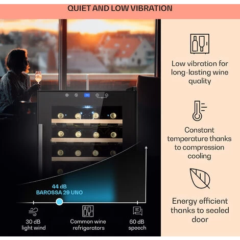For the love of wine: the Klarstein Barossa 29 Uno wine refrigerator ensures the best wine enjoyment by providing red and white wines with the right drinking temperature at the same time. The glass front door ensures a skilful presentation of the wine treasures, while the switchable interior lighting additionally sets the scene for the stored bottles. This makes the wine tempering cabinet a stylish visual highlight not only at home, but also in bars and restaurants.