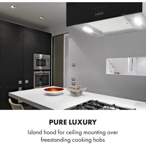 The outward appearance of the Klarstein Kronleuchter L island hood is stylish in Pure Ambience Design. The front and back are finished in luxurious black safety glass while the sides are finished in brushed stainless steel.