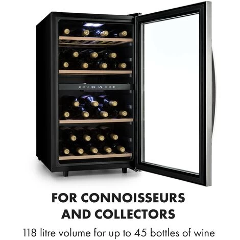 For the love of wine: The Klarstein Vinamour 45 Duo wine refrigerator ensures the best wine enjoyment by providing red and white wines with the right drinking temperature at the same time. With a volume of 118 litres, it accommodates up to 45 bottles of wine and cools them to either 5 to 12 °C in the upper cooling zone or 12 to 18 °C in the lower cooling zone. At the same time, the operation via touch control is convenient and simple. With the illuminated interior, elegant bottles are showcased beautifully and the glass door offers exciting insights.