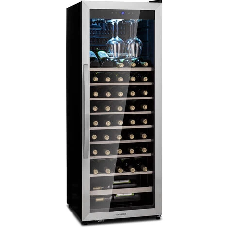For the love of wine: the Klarstein Vinamour 46 Uno wine refrigerator guarantees maximum enjoyment. With 155 litres of volume, it accommodates up to 46 bottles of wine on 10 levels and 9 wooden shelves and cools them to your desired temperature between 4 and 18 °C. In the upper part, there is a cool place to store 6 wine glasses – elegantly hanging upside down. Operation via touch control is convenient and simple. The illuminated interior skilfully showcases bottles and the glass door lets you see inside.