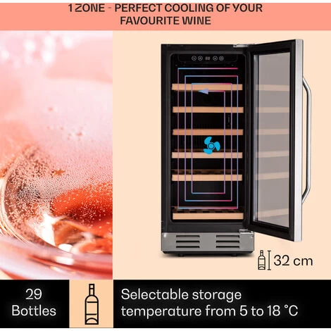 Elegant design and smart consumption: The Klarstein Vinovilla 29 Built-In Uno wine refrigerator is a practical wine cabinet, which enriches every living space and kitchenette with its modern glass door with seamless stainless steel front – welcome to the professional league of wine storage! Up to 29 bottles can be stored on the six wooden storage shelves and cooled at 5 – 18 °C. An integrated activated carbon filter enables odourless, long-term storage.