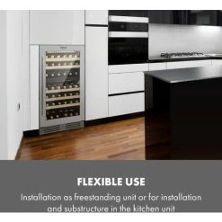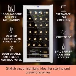 Klarstein Vinsider Built-in Wine Cooler, Single Zone Bar Fridge, Wine Coolers for Wine Bottles, Touch Pad, 5-22°C Range, 57 Litres, 24 BottlesTaking wine out of the restaurant and into the home, this 24 bottle drinks fridge allows you to build and store an exquisite collection of wine. Wine fridges are specifically built to protect a priceless collection from damage caused by incorrect storage temperatures, humidity, light, vibrations or poor air quality. This built-in wine fridge neatly fits into any home, tasting room, kitchen or indoor/outdoor bar area, giving quick access to your best wines chilled at their ideal temperature. White, Red and Rosé Wine StorageWhether you drink it for pleasure, health or to complement a rich meal, there’s a lot to love about wine. No matter your preference, this single zone mini fridge gives you full control of the storage climate. The cooling zone can be set from 5-22°C so it’s ideal for red, white, rosé and prosecco, chilling them for when it’s time to uncork and serve. There’s even enough space for champagne for a celebration.Elegant Design, Intuitive OperationAs much as we love the “rack ’em and stack ’em” approach to wine collecting, it’s not suitable for those who live in humid environments, nor is it an elegant way to store a collection of vintages. This wine cooler fridge lets you control the environment for longevity while displaying your wine collection in a refined, beautiful manner. The wine and beer cooler has a stainless steel frame and uses double-walled panoramic glass to give a constant view of your collection. This drinks cooler is controlled with a touch-sensitive panel that lets you easily set the temperature. Finally, UV protection minimises the damage from natural light. Product FeaturesSingle zone wine fridge fits 24 bottlesVibration free storageThree removable wooden shelvesLCD screen displays temperatureDimensions: 54 x 44 x 54 cm