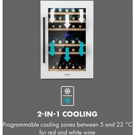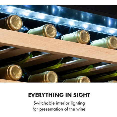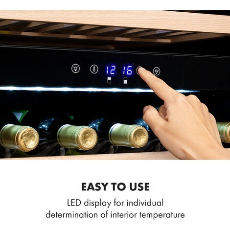On 3 wooden shelves, the Klarstein Vinsider 41D Built-In Duo wine refrigerator offers space for 41 bottles of wine. It not only offers perfect storage conditions, but also skilfully highlights the bottles. This way, you can highlight your fine wines and showcase them through the glass door in a sophisticated way. The two cooling zones with different temperatures allow you to cool white and red wines at the same time. The intuitive touch display with digital indication ensures a very convenient operation.