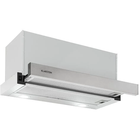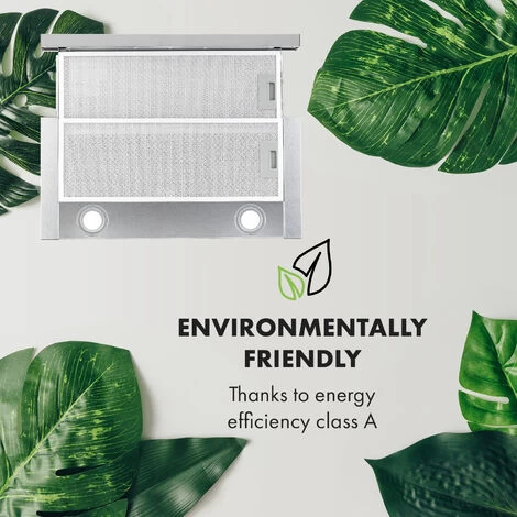The Klarstein Viola extractor hood is particularly attractive thanks to its telescopic function: simply pull the hood out for use and push it back into its substructure hiding place after use. The two attachment options allow you to decide flexibly where you want to attach your new kitchen helper: it can simply be mounted on the wall above the hob or attached under your wall cabinet. The two toggle switches make it extremely easy to control the light and air extraction. The chic stainless steel cladding is durable and easy to clean. The built-in grease filter is easy to remove and is easy to clean with water and a little washing-up liquid.