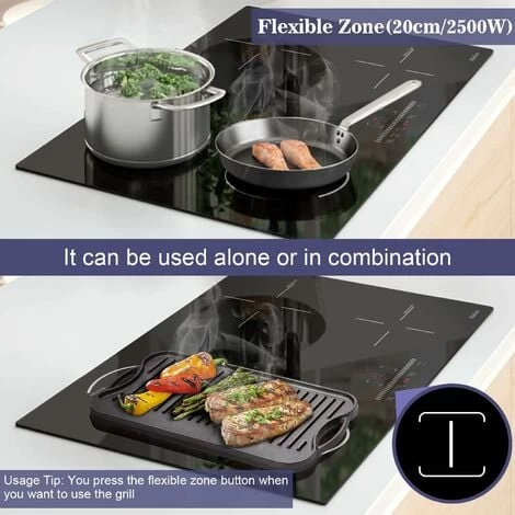 - ????【Flexible Zone】This area can be used as a large area or as two separate areas depending on the cooking needs at any time. The induction hob with flexible zone is particularly suitable for Grill Pan and round pan .You can get a large enough cooking zone to cook meat and fish evenly.